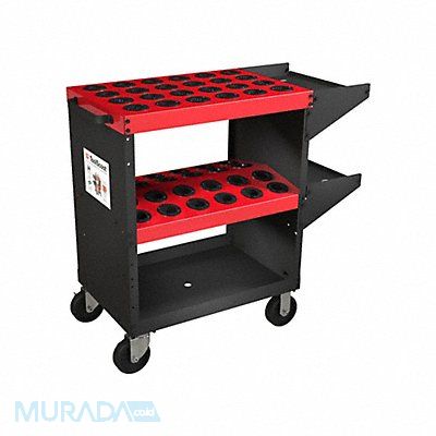 CNC ToolScoot 40 Taper Heavy-Duty Holds Up To 48 Tools Number of Shelves 2 Adjustable Load Rating 1000 Lb Width 35 1/4 In Depth 18 In Height 35 In Steel Sides and Shelves 16 Gauge Caster Type Plastic 2 Swivel Locking And 2 Fixed Caster Size 5 x 1 1/2 In Black Cart With Red Shelves Matted Sides Gloss Shelves Finish Rugged 12-Gauge Steel Handles Includes Nylon Shelf Inserts And Rubber Tray Liners