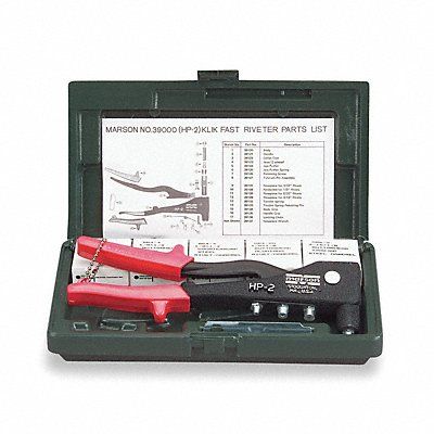 Rivet Tool Kit Rivet Tool Type Rivet Tool Kit For Rivet Material Aluminum Steel For Rivet Type Blind Nosepieces Included 3/32 in 1/8 in 5/32 in 3/16 in Rivet Type Included Blind Head Type Angled Overall Length 12 in Body Material Aluminum Container Type Case For Rivet Diameter 1/8 in 3/16 in Grip Material Rubber Composition Includes 25 Ea. of Nos. 4Y060 and 4Y020 Blind Rivets 50 Ea. of Nos. 4X578 4X641 4X580 No 4X577 HP-2(R) Deluxe Riveter Nosepiece Wrench Plastic Case