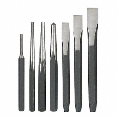 Punch and Chisel Set Set Type Punch and Chisel Set Types Included Center Punch Flat Chisel Pin Punch Starting Punch Number of Pieces 7 Blade Tip Shape Straight Blade Width 3/16 in 1/4 in 3/8 in 1/2 in 5/8 in 3/4 in Includes Handle No Chisel Type Flat Chisel Includes Handguard No Material Applications For Softer Metal Wood