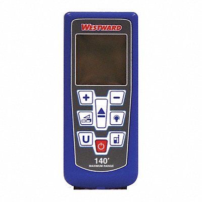 Laser Distance Meter Indoor Outdoor Maximum Measuring Distance 140 ft Accuracy +/-1/16 in Distance Meter Functions 1-Indirect Measure Addition and Subtraction Area Distance Volume Display Green Backlight Battery Type AAA Includes (2) AAA Alkaline Batteries Pouch Safety Strap