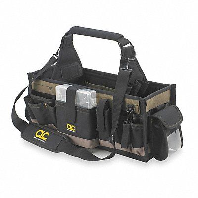 Tool Tote Bag Style Tool Tote Material Polyester Closure Type Open Top Number of Bags 1 Overall Height 15 in Overall Depth 12 in Overall Width 23 in Color Black Shape Rectangle Features Box-Shaped Design Prevents Tipping Over Includes 7 in x 5 1/2 in Multi-Compartment Plastic Tray Interior Dimensions 23 in L x 12 in W x 15 in H Number of Handles 2 Number of Inside Pockets 18 Number of Outside Pockets 25 Number of Pockets 42 Number of Shoulder Straps 1