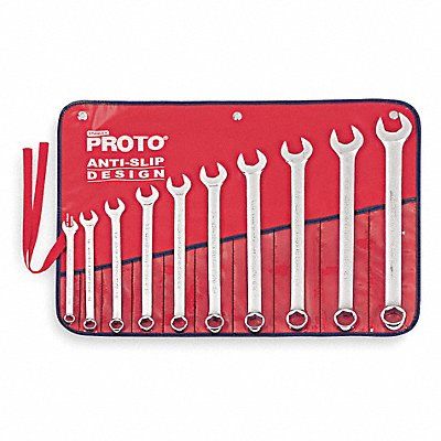Combination Wrench Set Alloy Steel Satin Number of Tools 10 Range of Head Sizes 7/16 in to 1 in Head Offset Angle 15 Degrees Offset Canvas Pouch SAE 7/16 in 1/2 in 9/16 in 5/8 in 11/16 in 3/4 in 13/16 in 7/8 in 15/16 in 1 in Rounded Opening Angle (Deg.) 15 Degrees