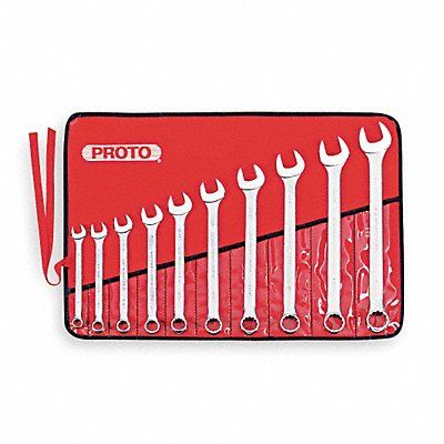 Combination Wrench Set Alloy Steel Satin Number of Tools 10 Range of Head Sizes 7/16 in to 1 in Head Offset Angle 15 Degrees Offset Canvas Pouch SAE 7/16 in 1/2 in 9/16 in 5/8 in 11/16 in 3/4 in 13/16 in 7/8 in 15/16 in 1 in Rounded Opening Angle (Deg.) 15 Degrees
