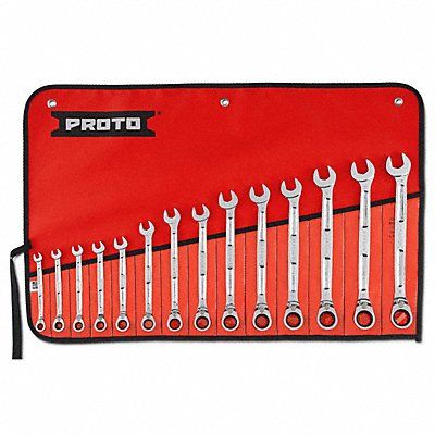Combination Wrench Set Alloy Steel Full Polish Chrome Number of Tools 14 Range of Head Sizes 6 mm-19 mm Head Offset Angle 15 Degrees Standard Tool Roll Metric Hex Opening Angle (Deg.) 15 Degrees