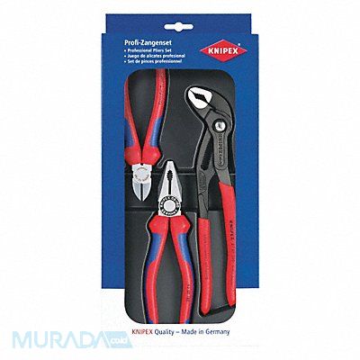 Plier Set ESD-Safe No Insulated No Number of Pliers 3 Plier Types Diagonal Water Pump Pliers Included 10 in Water Pump Plier 6 1/4 in Diagonal Cutter 7 1/4 in Combination Plier Jaw Opening Type Manual Voltage Rating None Grip Style Knurled Additional Tool Functions Cable Cutter Wire Cutter Container Type Plastic Part Cutting Capacities 1/8 in (Medium-Hard Wire) 3/32 in (Hard Wire) 5/32 in (Soft Wire) 5/64 in (Hard Wire) 9/64 in (Medium-Hard Wire)