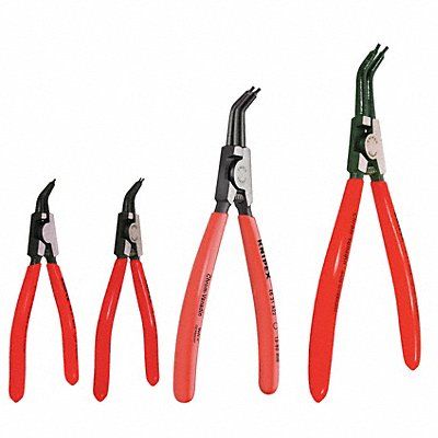 Retaining Ring Plier Set For Ring Type External Plier Types Retaining Ring Pliers Non-Sparking No Grip Style Standard Cushion Overall Length 5 1/4 in 7 1/4 in 8 1/4 in For Minimum Bore Diameter 1/8 in For Maximum Bore Diameter 3 15/16 in For Minimum Shaft Diameter 1/8 in 25/64 in 3/4 in 1 37/64 in For Maximum Shaft Diameter 25/64 in 63/64 in 2 23/64 in 3 15/16 in Tip Diameter 0.07 in Tip Angle 45 Degrees Jaw Opening Type Manual Number of Pliers 4 Container Type Pouch
