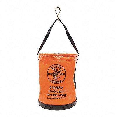 Bucket Bag Bag Material Vinyl Bag Type Straight Wall Body Color Orange Bottom Diameter 12 in Closure Type Open Top Features Swivel Snap Hook Attachment Type Single Handle With Snap Hook Material Weight 2.37 lb Number of Inside Pockets 0 Number of Outside Pockets 0 Number of Pockets 0 Overall Height 15 in Overall Width 12 in Reinforced Bottom Yes Shape Round Strap Material Polyester Top Diameter 12 in Total Load Capacity 100 lb Includes Hang Strap Yes