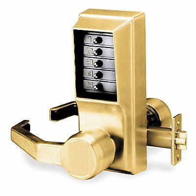 Mechanical Push Button Lockset Handle Type Lever Function Entry Key Override Options None Hand Right Finish Antique Brass Door Thickness 1-3/8 in to 2-1/4 in Keypad 5 Button Vandal Resistant Backset 2-3/4 in ADA Compliant Yes 3 hr Fire Rated Case Material Zinc Series L1000 Latch Length 1/2 in Max User Codes 1 Standards ANSI 156.2 Weather Resistant Yes Includes Code Change Plug and Access Key Lock Manual Required Installation Hardware Template Mechanical