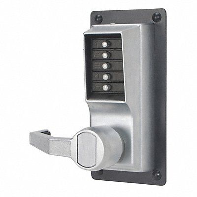 Mechanical Push Button Exit Trim Handle Type Lever Function Entry Key Override Options None Hand Left Finish Satin Chrome Door Thickness 1-3/8 in to 2-1/4 in Keypad 5 Button Vandal Resistant ADA Compliant Yes 3 hr Fire Rated Case Material Zinc Series LP1000 Max User Codes 1 Weather Resistant Yes Includes And Required Lock Installation Hardware Only Combination Change Tool Full-Scale Template Installation Manual Mechanical