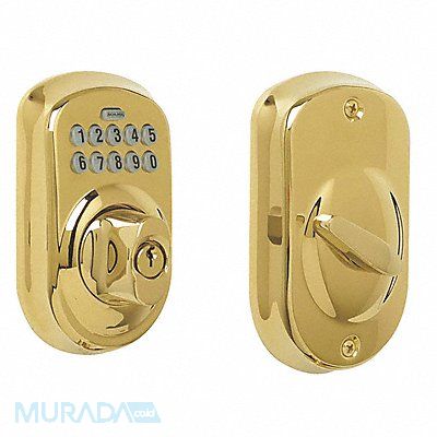 Electronic Keyless Deadbolt Function Auxiliary with Key Override Access Method Keypad Mounting Style Cylindrical Lock Material Nickel Silver Finish Bright Brass Series BE Handle Type None Door Thickness 1-3/8 in to 1-3/4 in Key Override Options Schlage inC in Keyway (Included) Hand Nonhanded Outside Height 5 1/2 in Outside Width 3 in Outside Depth 2 1/2 in Keypad Material Silicone Rubber Power Source Alkaline Battery Battery Life 3 yr Max User Codes 10 000 Grade 2