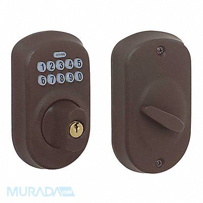 Electronic Keyless Deadbolt Function Auxiliary with Key Override Access Method Keypad Mounting Style Cylindrical Lock Material Nickel Silver Finish Oil Rubbed Bronze Series BE Handle Type None Door Thickness 1-3/8 in to 1-3/4 in Key Override Options Schlage inC in Keyway (Included) Hand Nonhanded Outside Height 5 1/2 in Outside Width 3 in Outside Depth 2 1/2 in Keypad Material Silicone Rubber Power Source Alkaline Battery Battery Life 3 yr Max User Codes 10 000 Grade 2