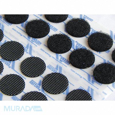 Reclosable Fastener Shapes Hook-and-Loop Hook and Loop Shape Disc Dot Dia 3/4 in Color Black Flame Retardant No Backing Material Nylon Shear Strength 14 psi Adhesive Type Rubber Adhesive Characteristics Industrial Strength Round Shape Reduces Peeling Water Resistant Adhesive Package Quantity 100