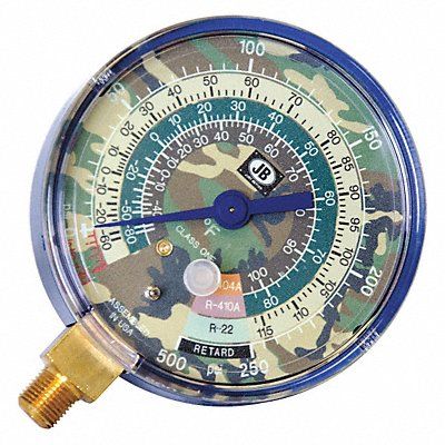 Replacement Low Side Pressure Gauge Diameter 3 1/8 in Working Pressure 30 in Hg to 500 psi Connection Size 1/8 in (M)NPT Color Camouflage Glow-in-the-Dark Gauge Type Non Liquid Filled Gauge Accuracy +/-1.00 Percent For Use With R-22 R-404A R-410A Application Replacement Manifold Gauge for Manifold Gauge Sets
