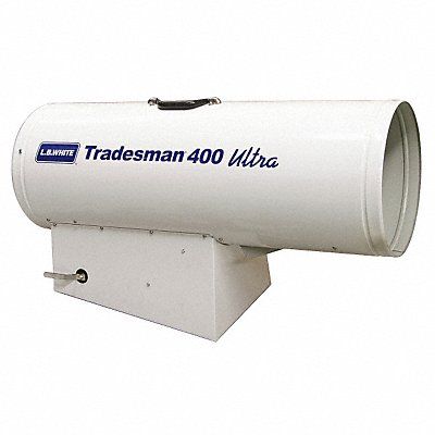 Portable Gas Torpedo Heater Fuel Type Propane Heating Capacity Output 400 000 BtuH Heating Area 9 000 sq ft Minimum Cylinder Size 500 lb Ignition Type Direct Spark Ignition Power Source Electric Thermostat Included Unit-Mounted Overall Height 21 1/2 in Overall Width 12 1/2 in Overall Depth 34 1/2 in Automatic Safety Shut-Off Included Yes Built-In Air Pressure Gauge Included Yes Digital Temperature Readout Included No Flame-Out Sensor Included Yes LED Diagnostics Included Yes