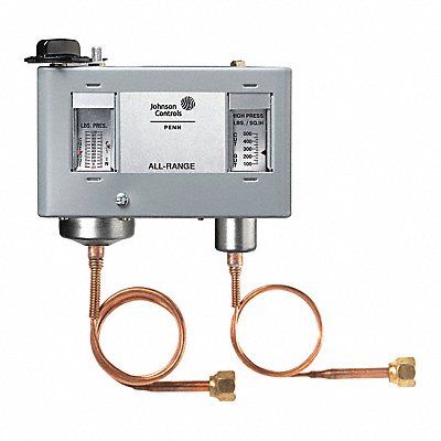 Dual Pressure Control Switch Type 2 SPDT Low Pressure Range (PSIG) 12 in Hg to 80 High Pressure Range (PSIG) 100 to 500 High Pressure Differential (PSIG) 55 psig Low Pressure Differential (PSIG) 5 to 35 Reset Low Auto Reset High Convertible Pressure Connection 36 in Capillary with 1/4 in Flare Nut