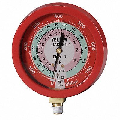 Replacement High Side Pressure Gauge Diameter 3 1/2 in Working Pressure 0 to 800 psi Connection Size 1/8 in (M)NPT Color Red Gauge Type Liquid Filled Gauge Accuracy +/-1.00 Percent For Use With R-22 R-410A Application Replacement Manifold Gauge for Manifold Gauge Sets