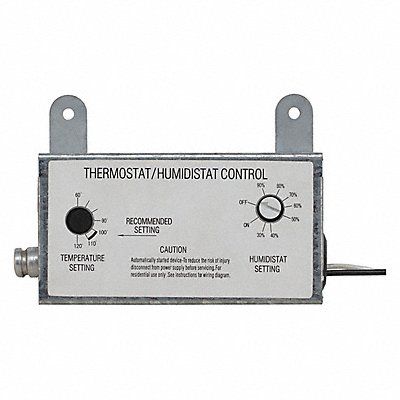 Attic Fan Thermostat/Humidistat Thermostat Switch Type 2 SPST Thermostat Control Range 60 Degrees to 120 Degrees F Thermostat Voltage 120V AC Full Load Amps @ 120VAC 10 A Thermostat Heating/Cooling Cooling Switch Action Close on Rise Number of Switches 2 Differential 10 Degrees F Height 4 3/16 in Width 6 1/4 in Depth 1 7/8 in Sensor Type Bi-Metallic Spring Color Galvinized Finish