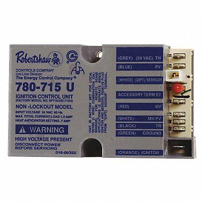 Universal Ignition Control Spark Ignition Nonlockout Electrical Connections Terminals 1.5 A 24 V AC Control Volts 1 1/2 in Combined Load 1.5 at .4 PF Flame Sensor Current .7 mA DC @ 25C / 24V AC Main valve 1 amp at .5 PF Pilot valve 1 amp at .5 PF 24 Gas Type NG/LP 3 in 3.5 Continuous 4 3/4 in For Use With 7000 BDER 7100 DER and 7200IPER Gas Valves