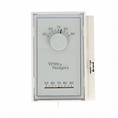 Low Voltage Thermostat Terminal Designations RH W System Switching Heat-Off Fan Switching No Automatic Changeover No Dual Transformer Compatible No Power Method Hardwired Voltage 20 to 30V AC 750mV Compatible Yes Mounting Vertical Height 4 1/2 in Width 3 1/4 in Depth 1 5/8 in Color White Control Range 50 Degrees to 90 Degrees F Features Mercury Free For Use With Millivolt Includes F92-0563 Kit Switched Subbase Standards NEC Class II