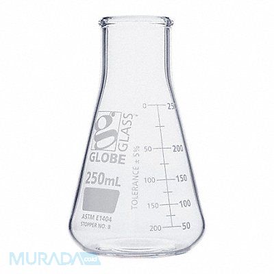 Erlenmeyer Flask Flask Type Erlenmeyer Labware Capacity - Metric 250 mL Labware Capacity - English 8.45 oz Labware Basic Material Glass Labware Body Material Type I Borosilicate Glass Labware Neck Style Straight Includes Closure No Graduation Range 50 to 250 mL Graduation Subdivisions 25 mL Labware Clarity Transparent Labware Body Color Clear Labware ASTM Specification E1404 Labware Closure Type Stopper Labware Height - Metric 136 mm Stopper Size 8 Package Quantity 12