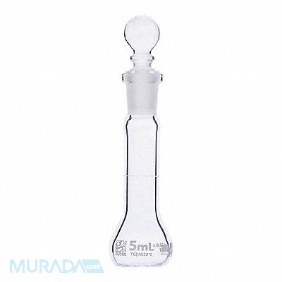 Volumetric Flask Flask Type Volumetric Labware Capacity - Metric 5 mL Labware Capacity - English 0.17 oz Labware Basic Material Glass Labware Body Material Type I Borosilicate Glass Labware Neck Style Straight Includes Closure Yes Labware Closure Color White Graduation Range No Graduations Labware Clarity Transparent Labware Body Color Clear Labware ASTM Specification E288 Labware Closure Type Pennyhead Stopper Labware Height - Metric 70 mm Stopper Size 9 Package Quantity 6
