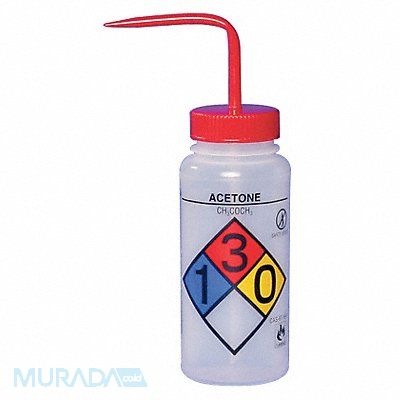 Wash Bottle Labware Capacity - English 16 oz Labware Capacity - Metric 500 mL Standard Spout Labware Basic Material Plastic Labware Body Material LDPE Labware Closure Material Polypropylene Wide Mouth Vented/Nonvented Vented Labware Closure Color Red Labware Clarity Translucent Labware Imprinting Acetone Autoclavable No Labware Body Color Clear Diameter 53 mm Package Quantity 4