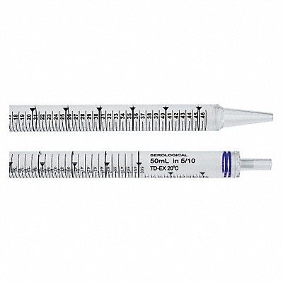 Pipette Serological Pipet Individually Wrapped Capacity 50 mL Graduation Range 3.5 to 50mL Material of Construction Plastic Graduation Subdivisions 0.5 mL Negative Graduations -10mL Tolerance 2 Percent Length 34.5 cm Band Color Purple Class A Sterile Standards ASTM E-934 Package Quantity 90