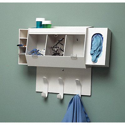 Personal Protection Organizer Wall-Mountable Holds etc. Gloves Protective Apparel Safety Glasses Number of Compartments 9 Height 20 in Width 18 1/8 in Depth 7 1/4 in Material PVC Color White Includes 1 Shelf 3 Covered Compartments 4 Safety Glass Cubbies a Glove Box Dispenser and 3 Hooks
