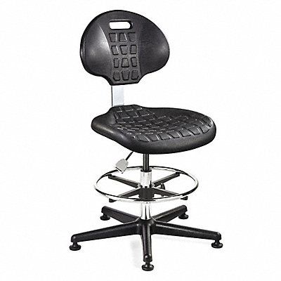 Cleanroom Chair Weight Capacity 300 lb Material Polyurethane Seat Height Range 19 in to 26-1/2 in Color Black Cushion 1-1/2 in Seat Width 18 1/2 in Seat Depth 17 in Back Height 12 1/2 in Back Width 16 1/2 in Base Five-Star Black Nylon For Workbench Ht. 29 in to 36-1/2 in Number of Casters 0 Number of Glides 5 Foot Support 18 in Adjustable Chrome Foot Ring Partially Assembled Standards ANSI/BIFMA Cal 117 Class 10 (ISO 4)