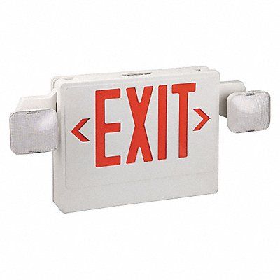 Exit Sign with Emergency Lights Letter Color Red Number of Faces 1 or 2 Directional Indicators - Emergency Lighting and Exit Signs Universal Field Selectable Chevrons Light Source- Emergency Lighting and Exit Signs LED Housing Material - Emergency Lighting and Exit Signs Plastic Housing Color - Emergency Lighting and Exit Signs White Battery Chemistry Sealed Lead Acid Voltage - Emergency Lighting and Exit Signs 120/277 Number of Lamp Heads 2