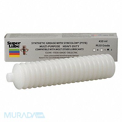 Multipurpose Grease NLGI Grade 2 Base Oil Synthetic Container Size 450 mL NSF Rating H1 Food Grade Grease Thickener PTFE Grease Color White Grease Container Cartridge Min Operating Temp -45 Degrees F Max Operating Temp 450 Degrees F Flash Point 428 Degrees F Dropping Point 550 Degrees F Four-Ball Wear Less Than 1.0 mm Specific Gravity 0.89 Timken OK Load 40 lb Standards NSF Registered Category Code H-1 Application Automated equipment requiring bellows type Container