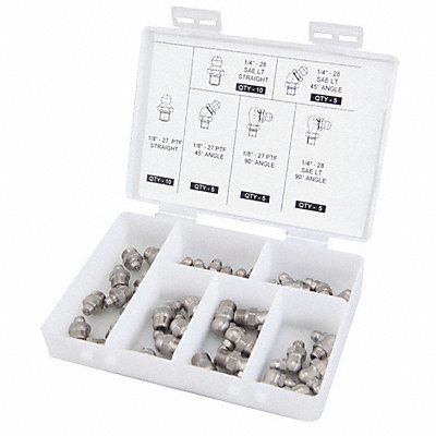 Grease Fitting Kit Grease Fitting Style Standard Fitting Material Stainless Steel Dimension Type SAE Thread Size 1/4 In.-28 1/8 In.-27 Thread Type SAE Tapered Number of Pieces 40