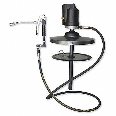 Grease Pump with Gun Air Motor Size 2 53/64 in Fits Container Size 35 lb/5 gal Pail Volume per Minute 1 lb Pump Ratio 50 1 Max Pressure 7 500 psi Air Inlet 1/4 in FNPT Grease Type NLGI 1 and 2 Hose Length 7 ft Material Brass Nitrile Polyurethane Rubber Steel and Zinc Drum Cover Dia 12 in Application Ideal for Applications Having Continuous Need for High Pressure Grease in Industry Workshops and Farm