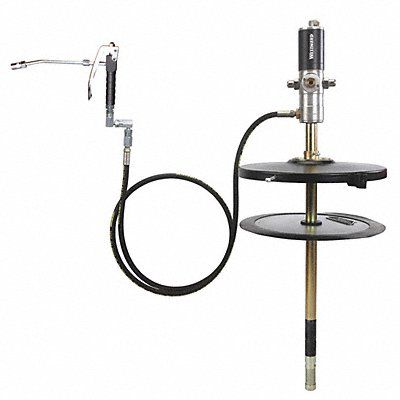 Grease Pump with Gun Air Motor Size 2 1/2 in Fits Container Size 120 lb/16 gal Drum Volume per Minute 2.4 lb Pump Ratio 50 1 Consumption @ 100 PSI 8.1 cfm Max Pressure 5 750 psi Air Inlet 1/4 in FNPT Grease Type NLGI 1 and 2 Hose Length 7 ft Material - Drum Cover Dia 12 in Application - Includes Connecting Hose Drum Cover Follower Plate Grease Control Valve Z-Swivel