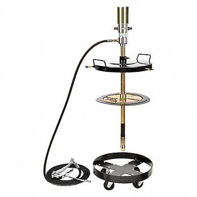 Portable Grease Pump with Gun Air Motor Size 2 1/2 in Fits Container Size 120 lb/16 gal Drum Volume per Minute 1.76 lb Pump Ratio 50 1 Consumption @ 100 PSI 4.3 cfm Max Pressure 5 800 psi Air Inlet 1/4 in FNPT Grease Type NLGI 1 and 2 Hose Length 13 ft Material Steel Includes Drum Cover Drum Trolley Follower Plate Grease Control Valve Hose