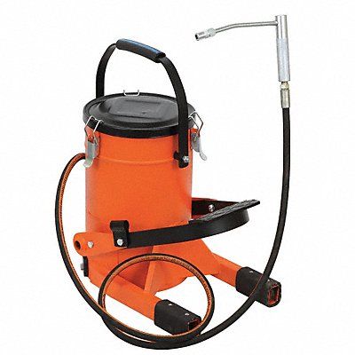 Grease Pump with Container Grease Pump Operation Foot Pedal Fits Container Size 22 lb Volume per Stroke 0.07 oz Grease Type NLGI 1 and 2 Max Pressure 8 700 psi Hose Length 6 1/2 in Material Nitrile Rubber Steel For Use With NLGI 1 and 2 Grease Application Convenient High Pressure Greasing of Fittings