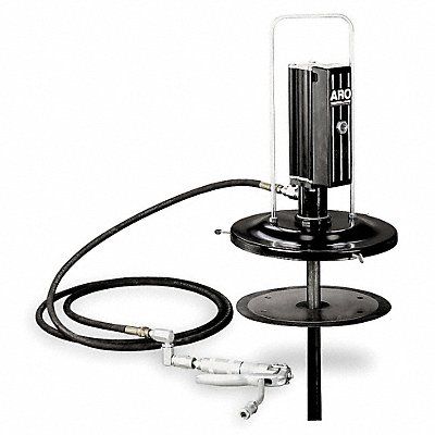 Grease Pump with Gun Air Motor Size 2 in Fits Container Size 35 lb/5 gal Pail Volume per Minute 9 lb Pump Ratio 50 1 Consumption @ 100 PSI 16 cfm Max Pressure 7 500 psi Air Inlet 1/4-18 NPTF Grease Type NLGI 1 and 2 Hose Length 10 ft Material Carbon Steel Tube Dia 1 1/2 in Application Automotive grease Features High-Flow Pump Ice-Free Air Motor Design Stall-Free Includes Pump Follower Plate Drum Cover Air Coupler/Connector Hose and High Pressure Gun Inlet/Outlet-Primer 3/8