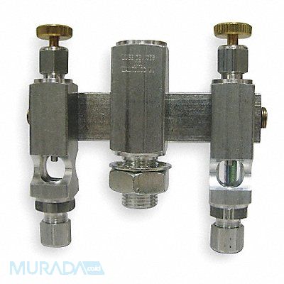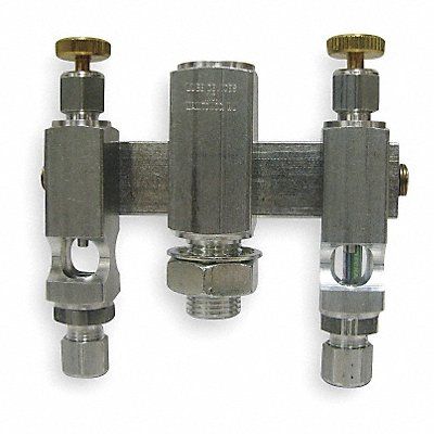 Needle Valve Manifold Number of Feeds 2 Overall Width 4 3/16 Inlet (In.) 1/4 NPTF Outlet (In.) 1/4 Tube Aluminum with Buna-N Seals and Glass Sights Includes 5/8 to 18 UNF Central Mounting