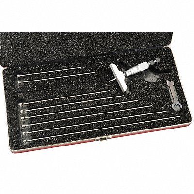 Mechanical Depth Micrometer Range 0 in to 9 in Resolution 0.001 in Accuracy +/-0.0001 in Long Form Calibration Certificate No Base Length 2 1/2 in Base Style Full Dimension Type Inch Included Certification No Mechanical Display Type None Number of Measuring Rods 9 Operation Type Mechanical Rod Diameter 1/8 in Anvil Material Steel Anvil Shape Round Case Included Yes Case Type Padded Case Features Combination Ratchet and Speeder for Uniform Pressure and Quicker Adjustment