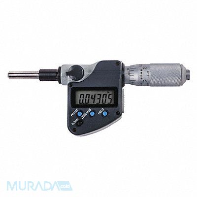 Digital Micrometer Head Range 0 in to 1 in 0 to 25.4 mm Resolution 0.00005 in/0.001 mm IP Rating IP65 SPC Output Yes Coolant Resistant Yes Dimension Type Inch/Metric Included Certification Certificate of Inspection Mouting Hub Diameter 3/8 in Operation Type Digital Rotating Spindle (Yes/No) Yes Spindle Shape Spherical Thimble Type Plain Battery Size SR44 Display Type LCD Features Digimatic Output Port Includes Spanner Includes Battery Yes Lock Nut Type Lever