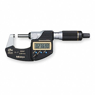 IP65 Digital Outside Micrometer Range 0 in to 1 in 0 to 25 mm Resolution 0.00005 in/0.001 mm Accuracy +/-0.00005 in IP Rating IP65 SPC Output Yes Data Output Type Cable Long Form Calibration Certificate No Coolant Resistant Yes Dimension Type Inch/Metric Included Certification Certificate of Inspection Operation Type Digital Thimble Type Ratchet Anvil Material Carbide Anvil Shape Flat Battery Size SR44 Case Included Yes Case Type Plastic