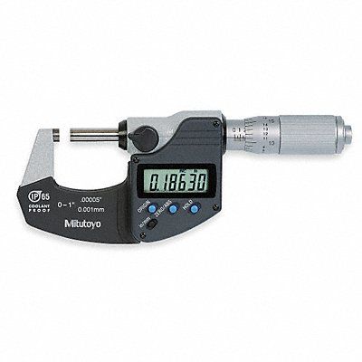 IP65 Digital Outside Micrometer Range 0 in to 1 in 0 to 25.4 mm Resolution 0.00005 in/0.001 mm Accuracy +/-0.00005 in IP Rating IP65 SPC Output Yes Long Form Calibration Certificate No Coolant Resistant Yes Dimension Type Inch/Metric Included Certification Certificate of Inspection Operation Type Digital Thimble Type Ratchet Anvil Material Carbide Anvil Shape Flat Battery Size SR44 Case Included Yes Case Type Plastic Display Type LCD