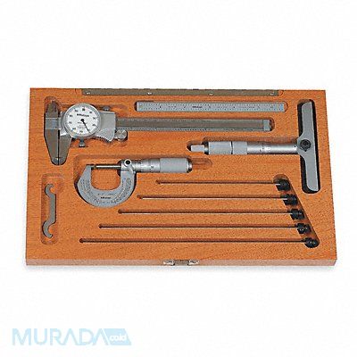 Precision Measuring Tool Kit Number of Pieces 5 Micrometer Range (In./mm) 0 to 1 in Micrometer Resolution (In./mm) 0.0001 in Friction Thimble Caliper Range (In./mm) 0 to 6/0 to 150 Caliper Resolution (In./mm) 0.001 in Range per Revolution (In.) 0.100 Includes (1) Case (1) Outside Micrometer (1) Depth Micrometer (1) Flexible Rule (1) Dial Caliper