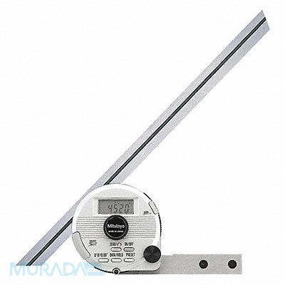 Digital Bevel Protractor Range -360 Degrees to 360 Degrees Bevel Protractor Resolution 1 min (0.01 Degrees ) Blade Length 12 in Operation Type Digital Battery Size CR2032 Display Type LCD Includes Battery Plastic Case Blade Clamp Box Includes Battery Yes Repeatability +/-1 min