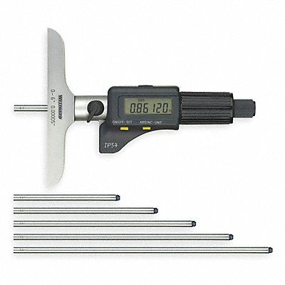 Digital Depth Micrometer SPC Output No Base Style Full Range 0 to 150 mm 0 to 6 in Resolution 0.00005 in/0.001 mm Base Length 4 in Number of Measuring Rods 6 Long Form Calibration Certificate No IP Rating IP54 Thimble Ratchet Anvil Flat Spindle Flat Number of Gauges 1 Movement of Screw 1 in Rod Dia 0.175 in Rotating Spindle (Yes/No) No Anvil Material Steel Spindle Material Steel Lock Nut Type Lever Features Easy Snap-Fit Rods IP-54 Includes Fitted Case