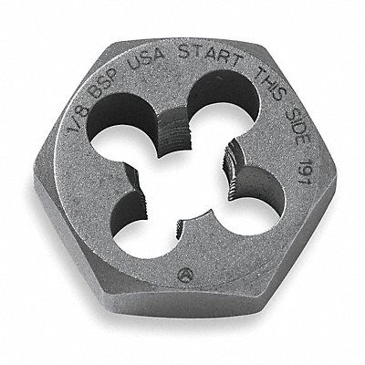 Hex Threading Die Thread Size 1/2 In.-13 UNC Self-Aligning Die Material Carbon Steel Thread Type NC Threads per Inch 13 Thread Direction Right Hand Die Thickness 3/8 in Die Shape Hex Hex Size 1 in