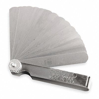 Feeler Gauge Set Finish Unfinished Blade Length 3 5/16 in Blade Material Steel Blade Style Short Blade Dimension Type Metric Included Certification None Maximum Thickness - mm 1 mm Minimum Thickness - mm 0.04 mm Non-Marring No Number of Feeler Blades 25 Thickness Range 0.04 mm to 1.00 mm Tolerance +/- 4 Percent Blade Width 1/2 in Color Silver Holder Material Steel
