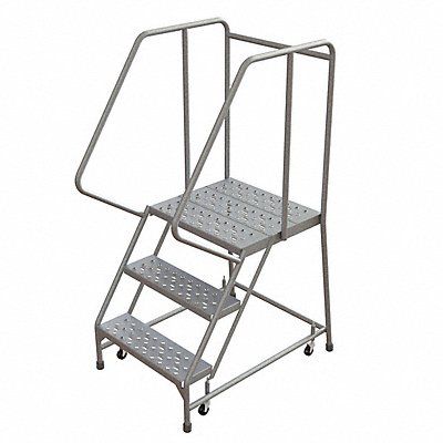 Rolling Ladder Material Aluminum Platform Height 30 in Handrails Included Yes Overall Height 62 in Number of Steps 3 Assembled Load Capacity 350 lb Step Tread Perforated Platform Depth 21 in Platform Width 24 in Bottom Width 29 in Base Depth 31 in Climbing Angle 56 Degrees Step Width 24 in Ladder Actuation Spring Loaded Casters Color Silver Rear Exit No