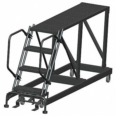 Single Access Rolling Platform Material Steel Platform Style Single Access Platform Height 40 in Load Capacity 800 lb Base Depth 90 in Bottom Width 33 in Platform Depth 72 in Platform Width 24 in Overall Height 3 ft 4 in Number of Legs 2 Number of Steps 4 Step Width 24 in Step Depth 7 in Climbing Angle 59 Degrees Step Tread Serrated Color Gray Finish Powder Coated Standards OSHA and ANSI Includes Lockstep and Push Rails Manufacturers Warranty Length 1 yr