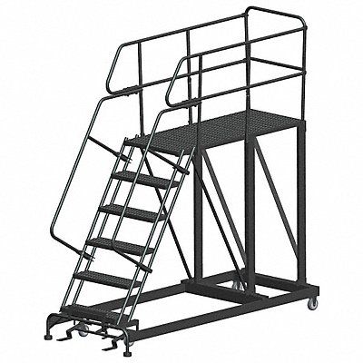 Single Access Rolling Platform Material Steel Platform Style Single Access Platform Height 60 in Load Capacity 800 lb Base Depth 90 in Bottom Width 38 in Platform Depth 60 in Platform Width 36 in Overall Height 8 ft 3 in Handrail Height 36 in Number of Guard Rails 3 Number of Legs 2 Number of Steps 6 Step Width 36 in Step Depth 7 in Climbing Angle 59 Degrees Step Tread Serrated Color Gray Finish Powder Coated Standards OSHA and ANSI Includes Lockstep and Handrails